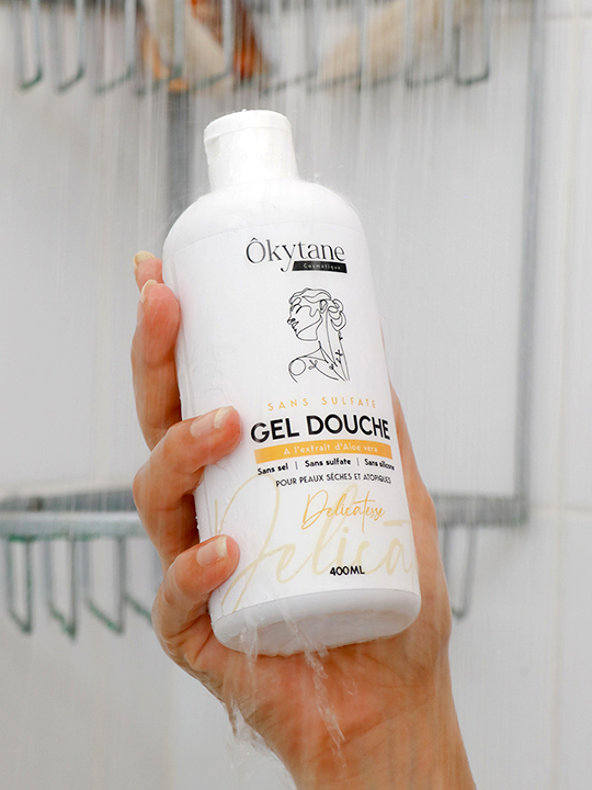 ÔKYTANE Gel Douche Délicatesse nettoie la peau en douceur tout en l’hydratant. Sa formule sans sulfate, enrichie en Aloe Vera et glycérine, respecte le film hydrolipidique et soulage les peaux sèches et sujettes aux irritations.
