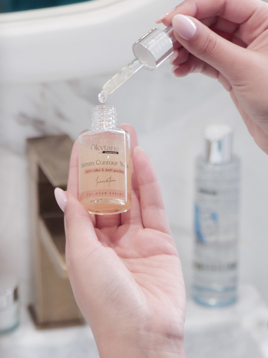 - Soir : Appliquez quelques gouttes de l’ÔKYTANE Sérum Contour Yeux sur une peau propre et démaquillée.