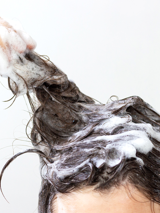 1. Appliquez une noisette de shampoing sur cheveux mouillés.